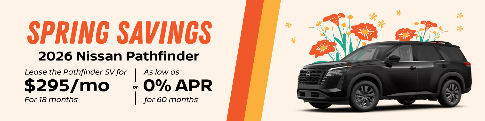 Disclaimer: Example VIN: 5N1DR3BS7TC228728. MSRP: $42,510. Lease is $295/mo for 18 months with $2,395 down excluding tax, tag and title fees. Lease is only for Pathfinder SV. After lease buyout price is $39,268.12. As low as 0% APR for 60 months, or 2.9% APR + $2,000 customer cash for 72 months. Available on 2026 Nissan Pathfinder from new dealer stock when financed through nissan motor acceptance company (nmac). On approved credit. price excludes tax, tag, and other governmental fees, $198.50* private tag agency charge and $799.00* pre-delivery service charge. offer ends: 5/04/2026.